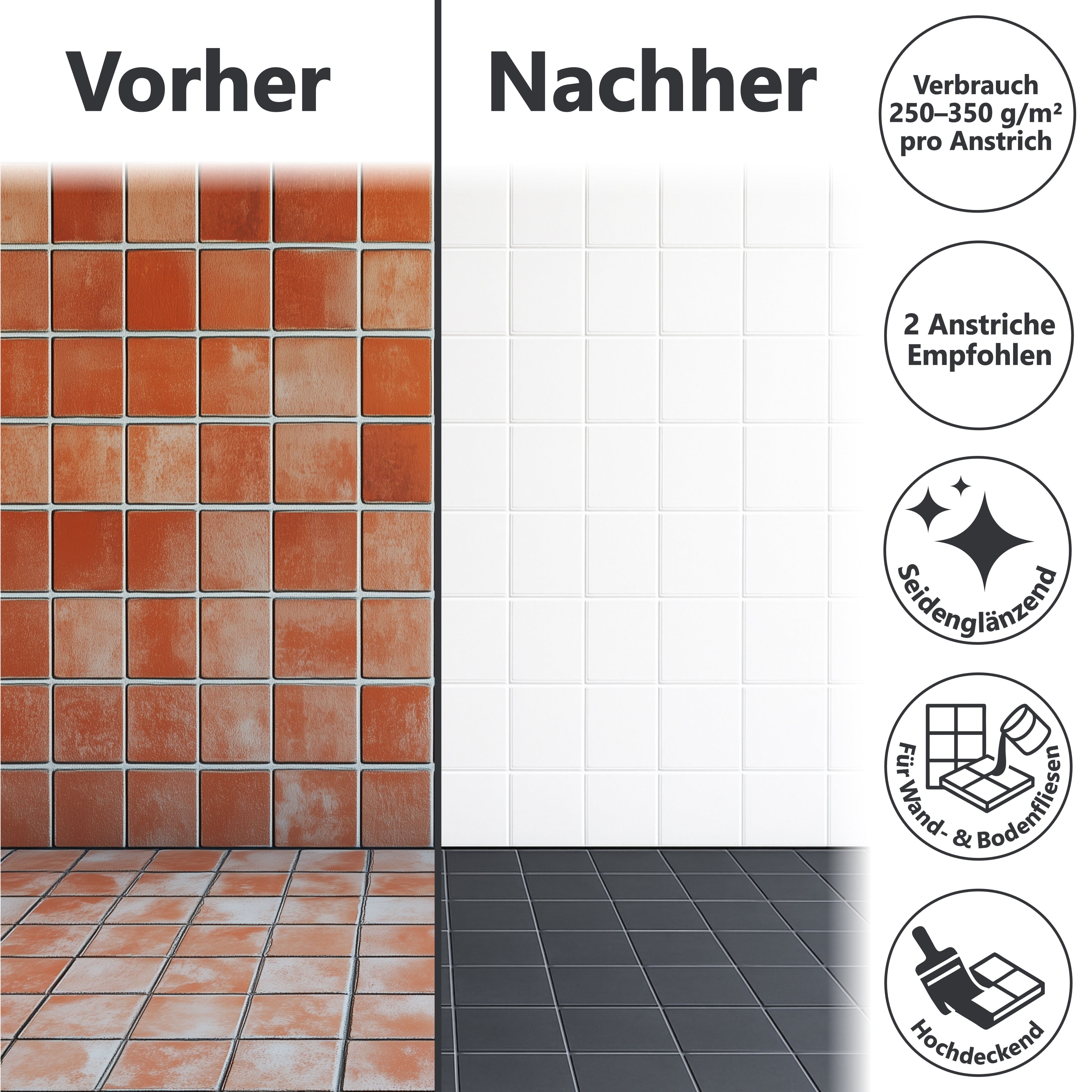 Può anche vedere la nostra W713 – Vernice per piastrelle monocomponente per superfici senza contatto diretto con l'acqua. L'applicazione della vernice per piastrelle W713 è ancora più semplice, la vernice è con finitura satinata.